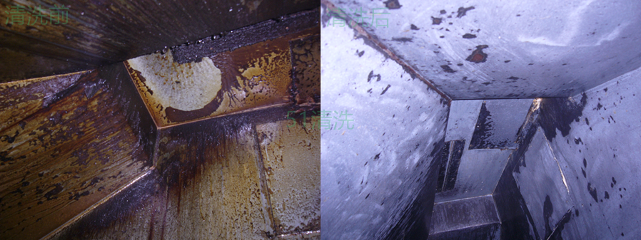 抽油烟机系统是现代大型厨房的必备设施,由于抽油烟机系统在长时间的工作使用中吸入大量的油烟,其中的废油就会吸附在吸顶、烟道和风机上,形成油污油垢。这些油污油垢主要是由油脂入油脂氧化、聚合物和附着在空气中的灰尘和微生物等组成。因常用食用油污不同于其它油污,它以氧化、聚合、交联等反应形成高分子化合物后,沉积并牢牢地粘结在系统表面(风机、烟道、风扇、水槽、喷雾头等)形成近似油漆的油污垢。因此,清洗除垢十分困难。 抽油烟机系统如果长期不清洗就会使系统的工作效率下降,使用寿命缩短,人员工作环境下降、环境卫生状况恶化,从而影响厨房的形象,严重的会导致火灾的发生. |